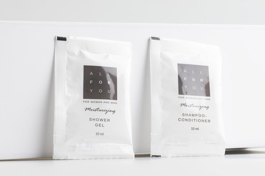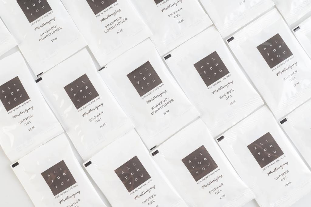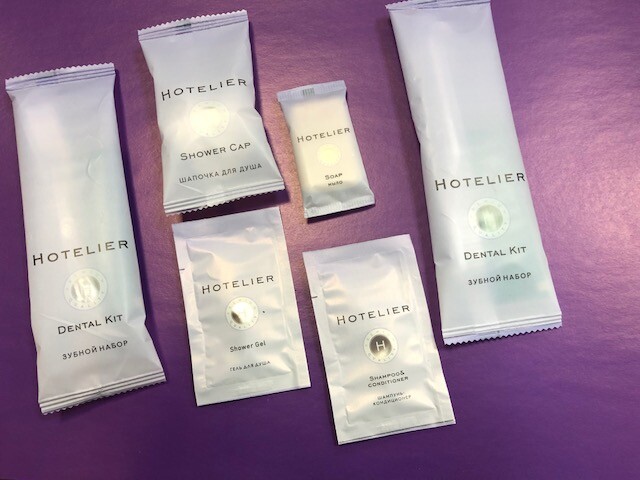 Так же в ассортименте присутствует продукция в прозрачной упаковке, сопутствующие товары (таблички для двери, пакеты для прачечной, гигиенические пакеты и прочее), и шампуни, гели, мыло в большом литраже (5 литровые канистры и бутыли).